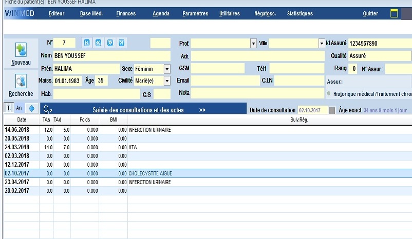 **Rép.**: il est possible d'utiliser l'interface actuelle et de l'aménager suivant les épisodes de soins avec le champs du suivi régulier, en marquant chaque épisode de soin distinct d'un signe caractéristique qui pourrait relier les consultation qui y sont rattachées. Pour les autres il suffit de caractériser les consultations par l'épisode les liant comme ici : **INFECTION URINAIRE** ou **CHOLECYSTITE AIGUE** (**EPISODE DE SOIN**)...puis on accède au contenu de chaque consultation en cliquant sur sa date comme d'habitude